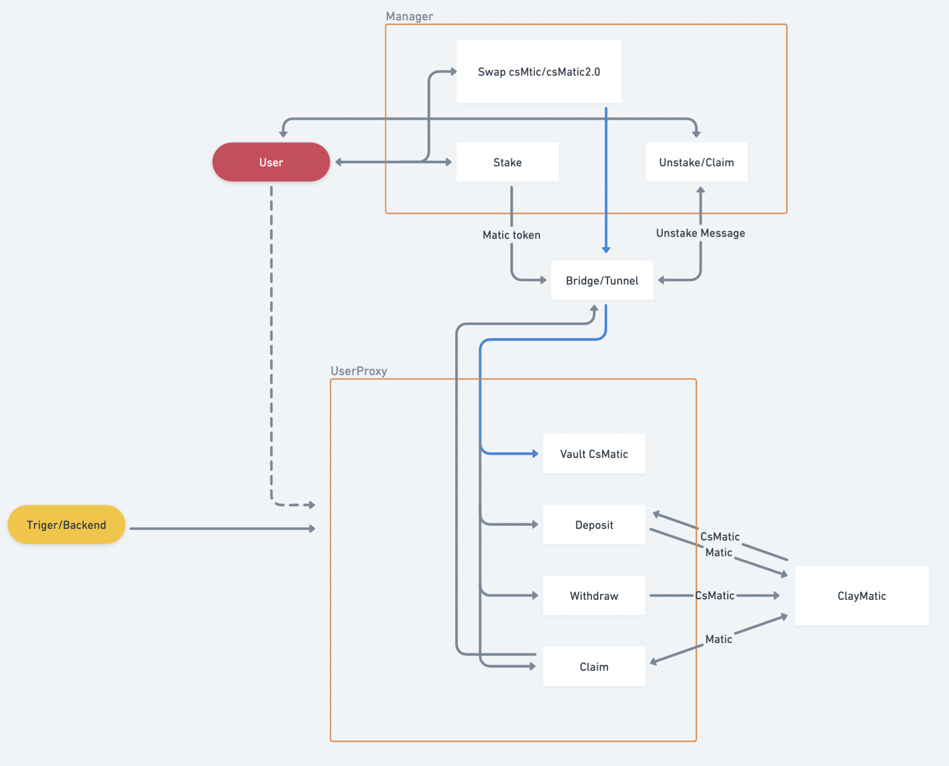 The solution on Polygon will allow to user to stake and receive in exchange csMATIC (Polygon's version). The system then stakes the user provided MATIC and mints csMATIC on ethereum. Unstaking follows a similar process where the user burns the csMATIC and will wait the unbonding period in order to claim the bridged MATIC. The native (ethereum) staking/unstaking is not handled directly, but instead is taken care of by ClayMatic in isolation, i.e. the system, on ethereum acts as a proxy for the user action, but doesn't require the user to self bridge and pay for gas prices.